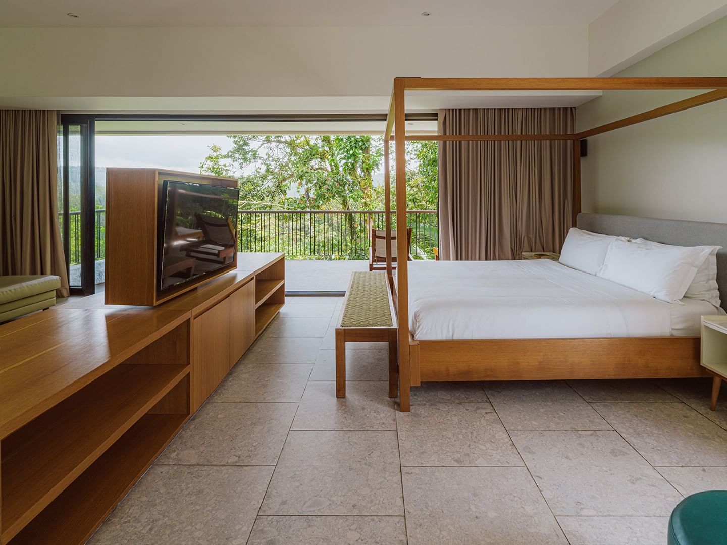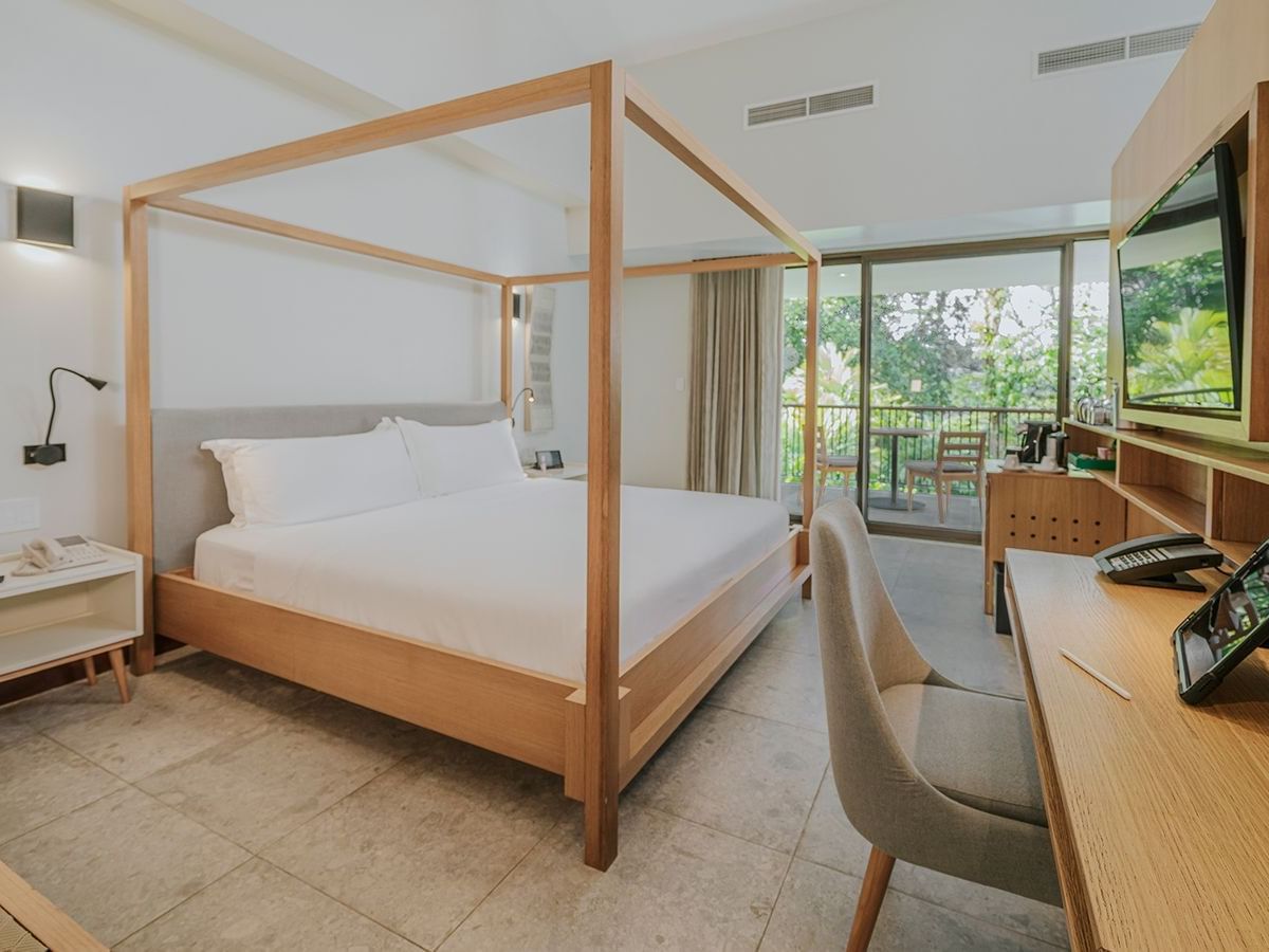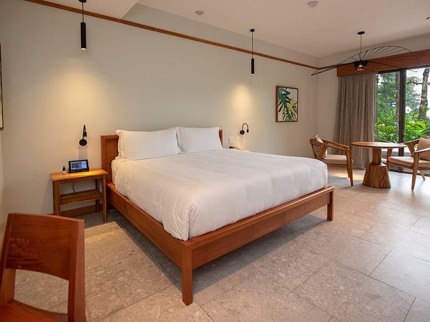 Comodidad refinada con ropa de cama de lujo y vistas a la selva tropical por todas partes.