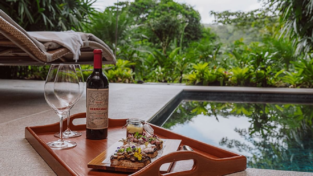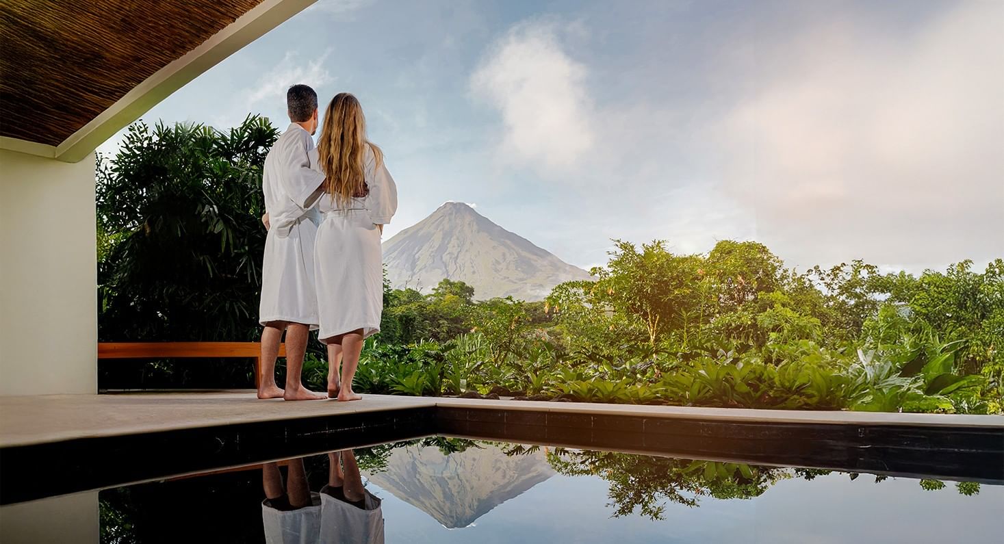 Escapada romántica con piscina termal y vistas privadas a la selva tropical.